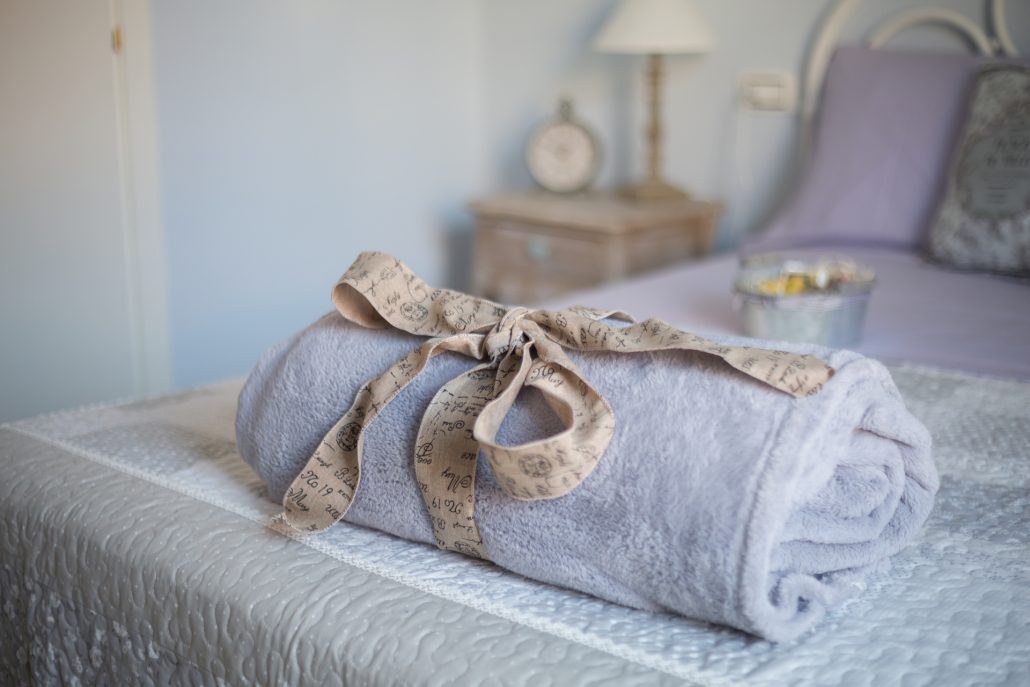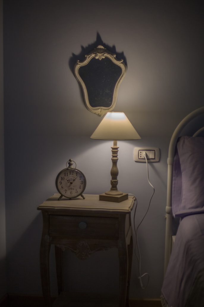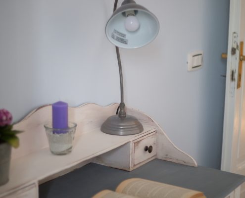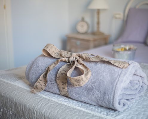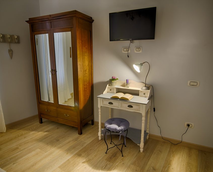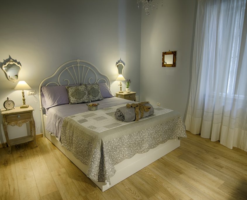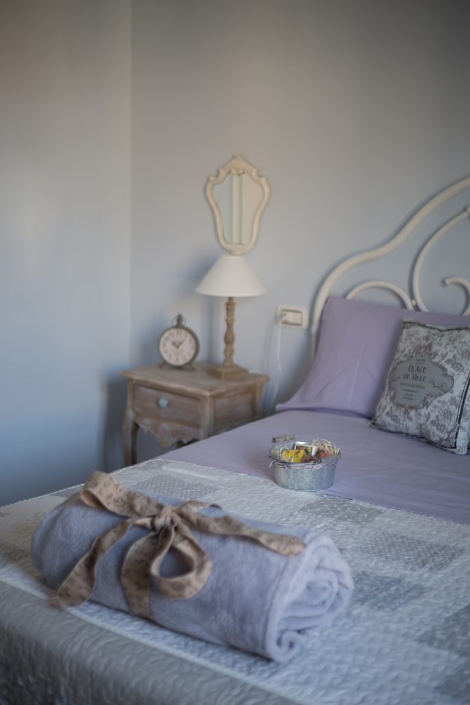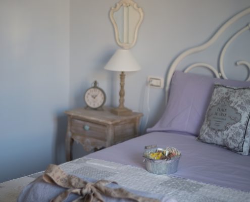 La camera pervinca è arredata in maniera sobria e rilassante.